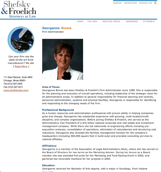 One of my all-time favorite Administrators is retiring this week — Shefsky & Froelich’s Georganne Binnie. She’s been at the firm 15 years.