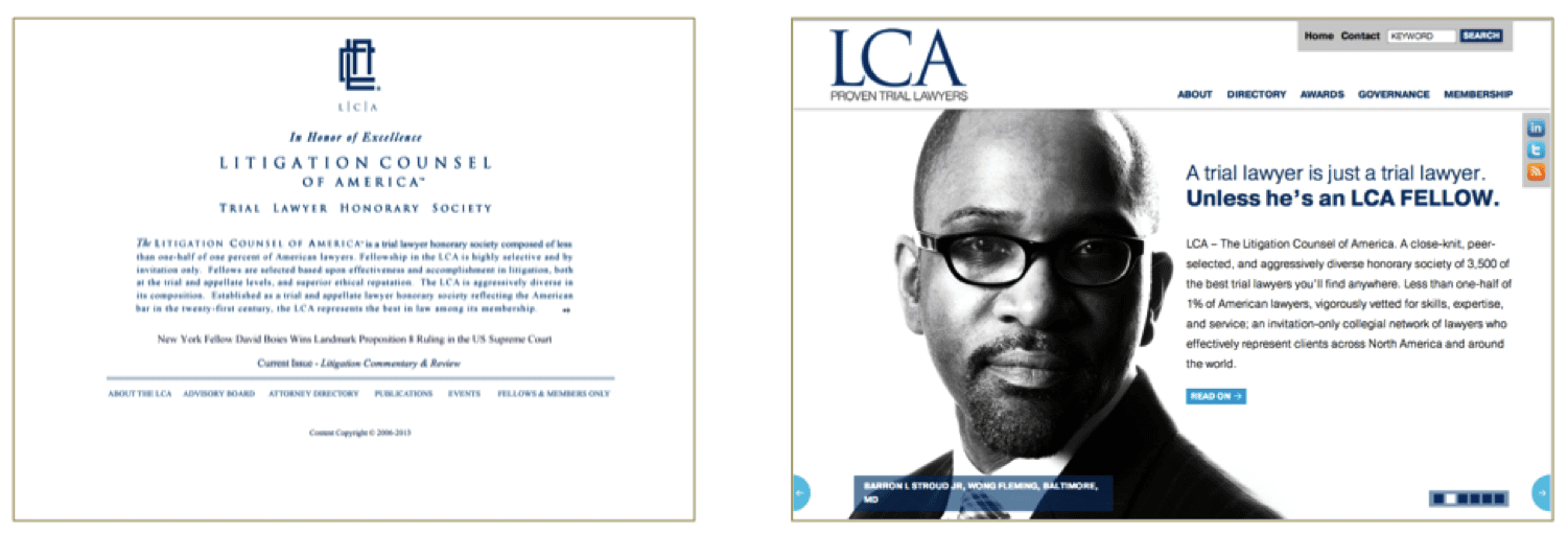 A group this prestigious deserves highly credible marketing, and it was time for a makeover.  Its original website was intentionally sparse and understated, but website design had changed and LCA needed a dramatic new look to reflect its legal industry leadership.