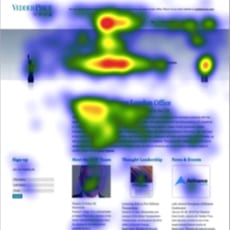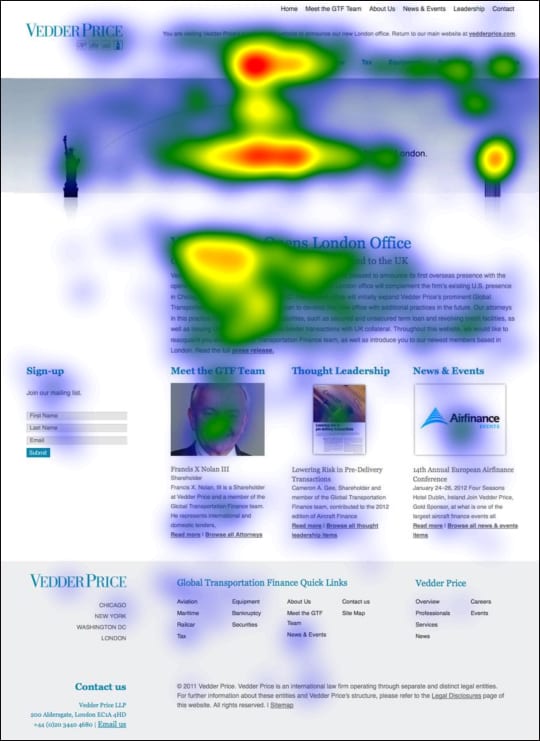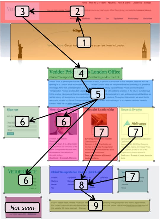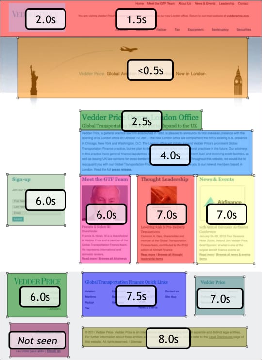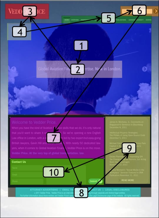 In both layouts the firm name is the third place viewers’ eyes go. In the “Icons” design, the important content headline, “Vedder Price’s New London Office” is the fourth visual point, and viewers spent 2.5 seconds reading it, then spent 4 seconds scanning the supporting News paragraph – another good result. In contrast, in the “Hats” layout, the actual information we want site visitors to remember is not noticed until the seventh Fixation Point. This layout takes a bit too long to get to the real information, and we risk losing the viewers before they learn what we want them to know.