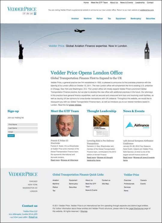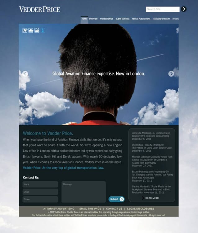 Vedder Price is a 250-lawyer Chicago-based national full-service law firm. As described in other case studies, we’d developed a series of campaigns to use on the London-based Global Transportation Finance website, which we narrowed to two finalists, which we entitled “Icons” and “Hats.”