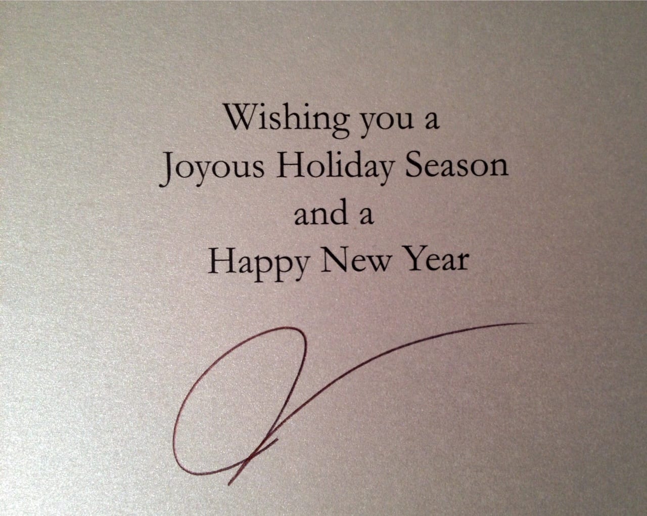 Who sent it?  I have absolutely no idea – I can’t read the hurried name/initial/signature.  What name or letter is this?  What does this card indirectly say to me?  Basically, “You’re just one of 1,000 cards I’m sending this year, and I’m too busy to care.”  I’ve cropped out the firm’s embossed name to protect his/her identity.  I’m not really feeling the Joy that the card invites.